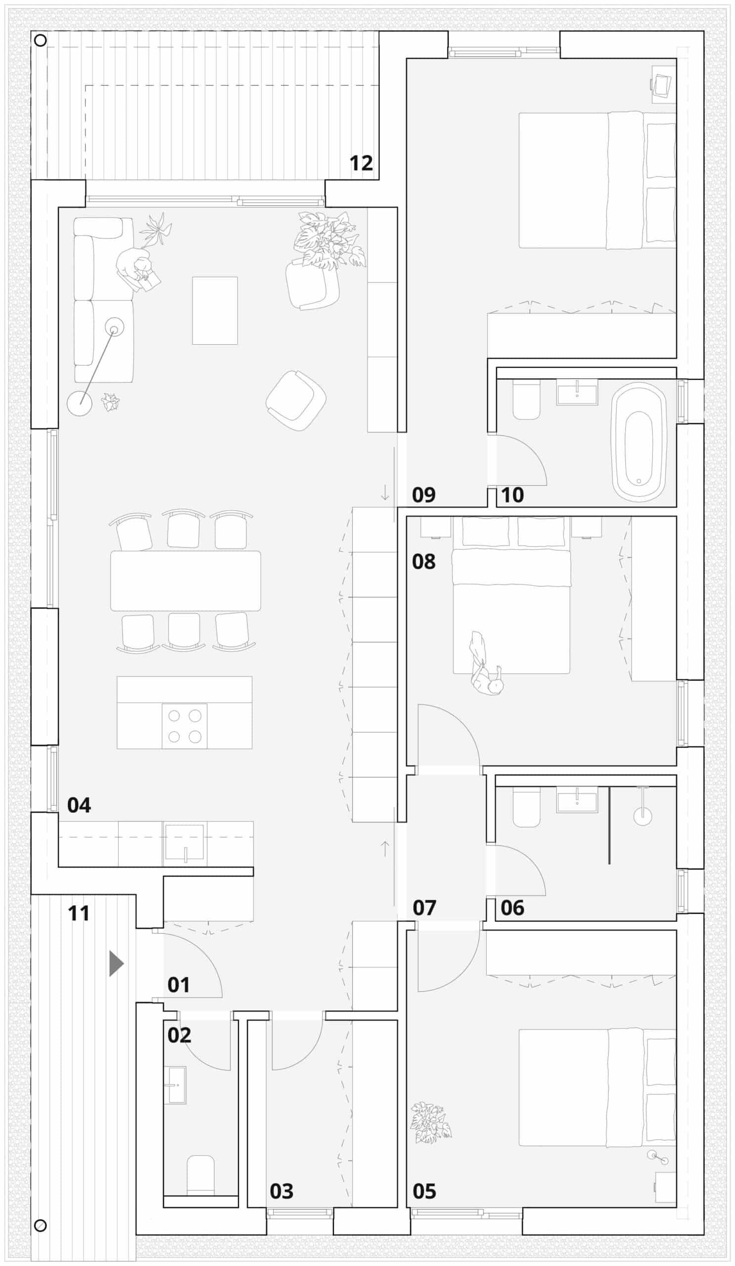 A TERRA házunk minden négyzetmétere átgondolt: nincsenek felesleges közlekedők vagy sötét folyosók, csak világos, funkcionális helyiségek – tágas amerikai konyhás nappalival, 3 hálószobával és 2 fürdővel a 105 m2-es alapterületen. A fedett terasz természetes meghosszabbítása az élettérnek, így a mindennapok és a vendégfogadás is kényelmesebb. A gondosan átgondolt elrendezés rugalmasan illeszkedik különböző telekviszonyokhoz. Ez az otthon a praktikumot és az eleganciát egyesíti – minden részlete azért született, hogy tökéletesen illeszkedjen az Ön életéhez.